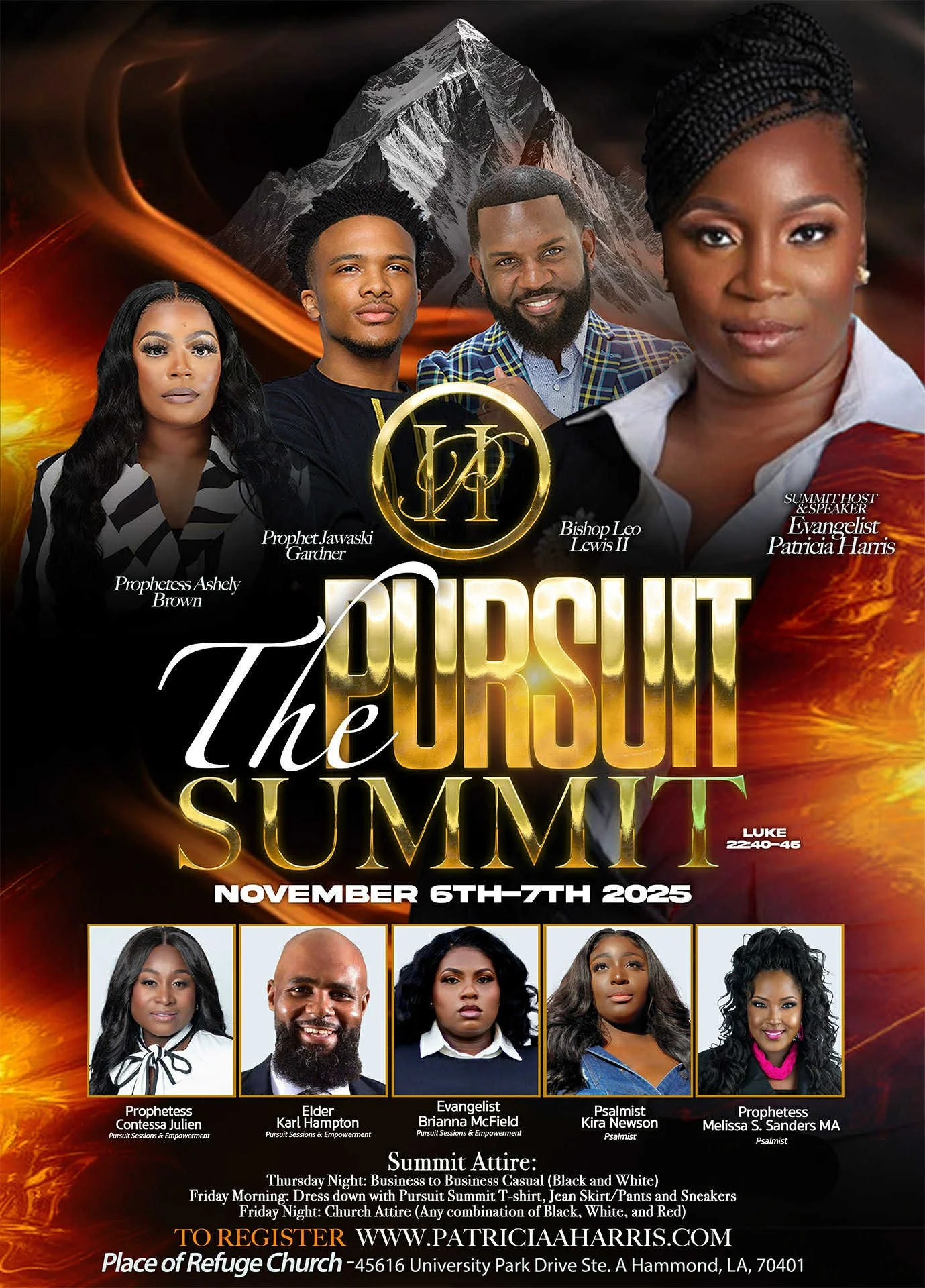 Have you been in a space where it seems your prayers are not being answered, results are far in-between, you are stagnant in purpose, or you may need the push to get back in the fight? Well, if this is you, The Pursuit Summit is the place for you! Get ready for a divine encounter where heaven comes to Earth, that will change the course of your life, shift your mindset, and push you pass your comfortable limits.